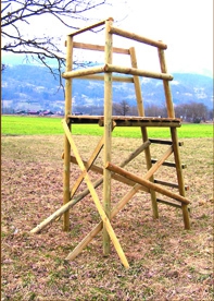 Avec platine-cadre métallique 1,10x1,00 m, poteaux en rondin diam.80, barreaux d'échelle carré 50x50, contreventements 1/2 rondin de 80, plancher epaisseur 27m/m anti-dérapant. Main courante servant de barre de tir, garde-corps pouvant recevoir une planche siège. Camouflage de la plateforme en brande de jonc ou filet camo en option. Livraison en kit (L'échelle montée sert de berceau pour le bois)